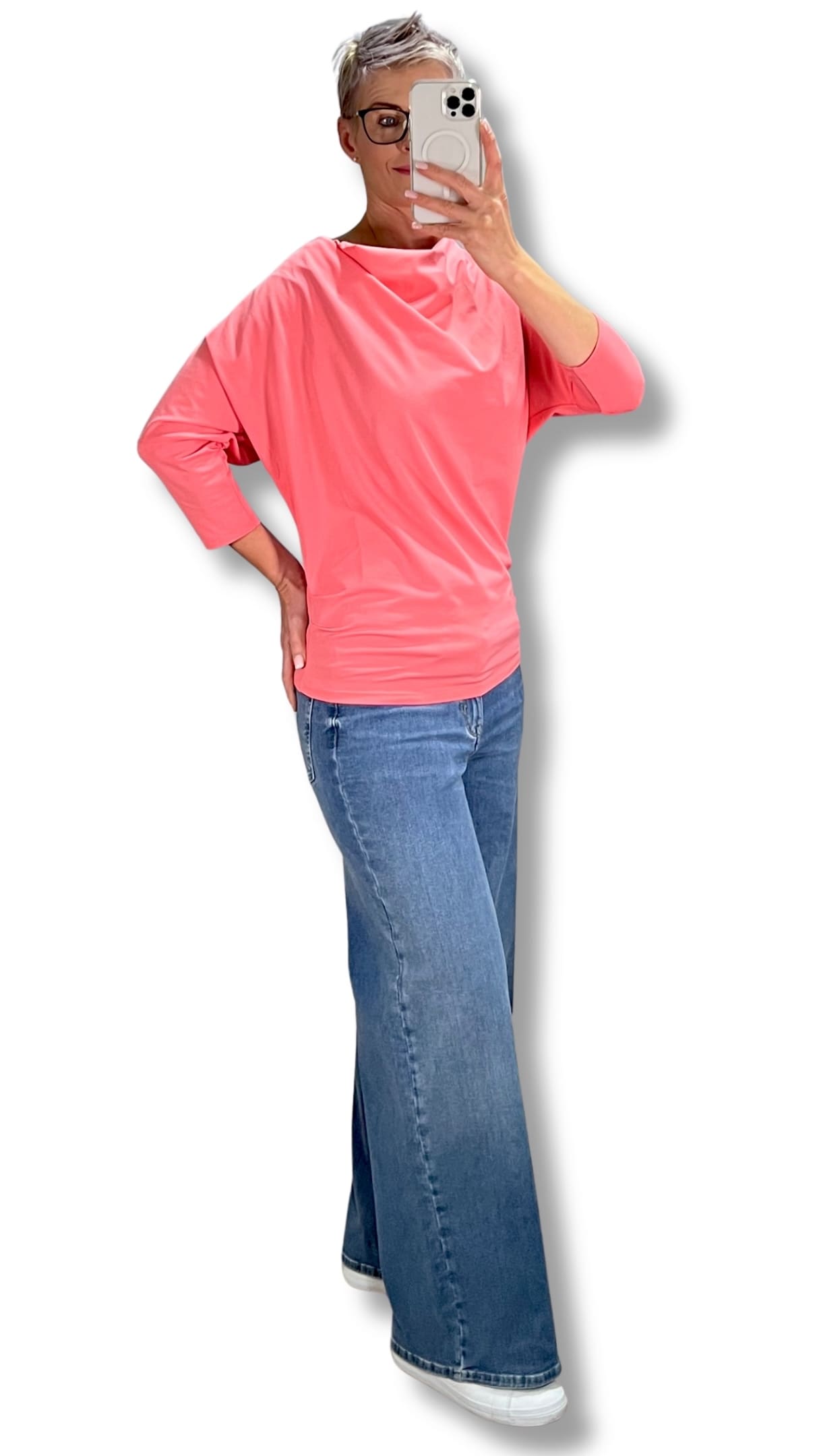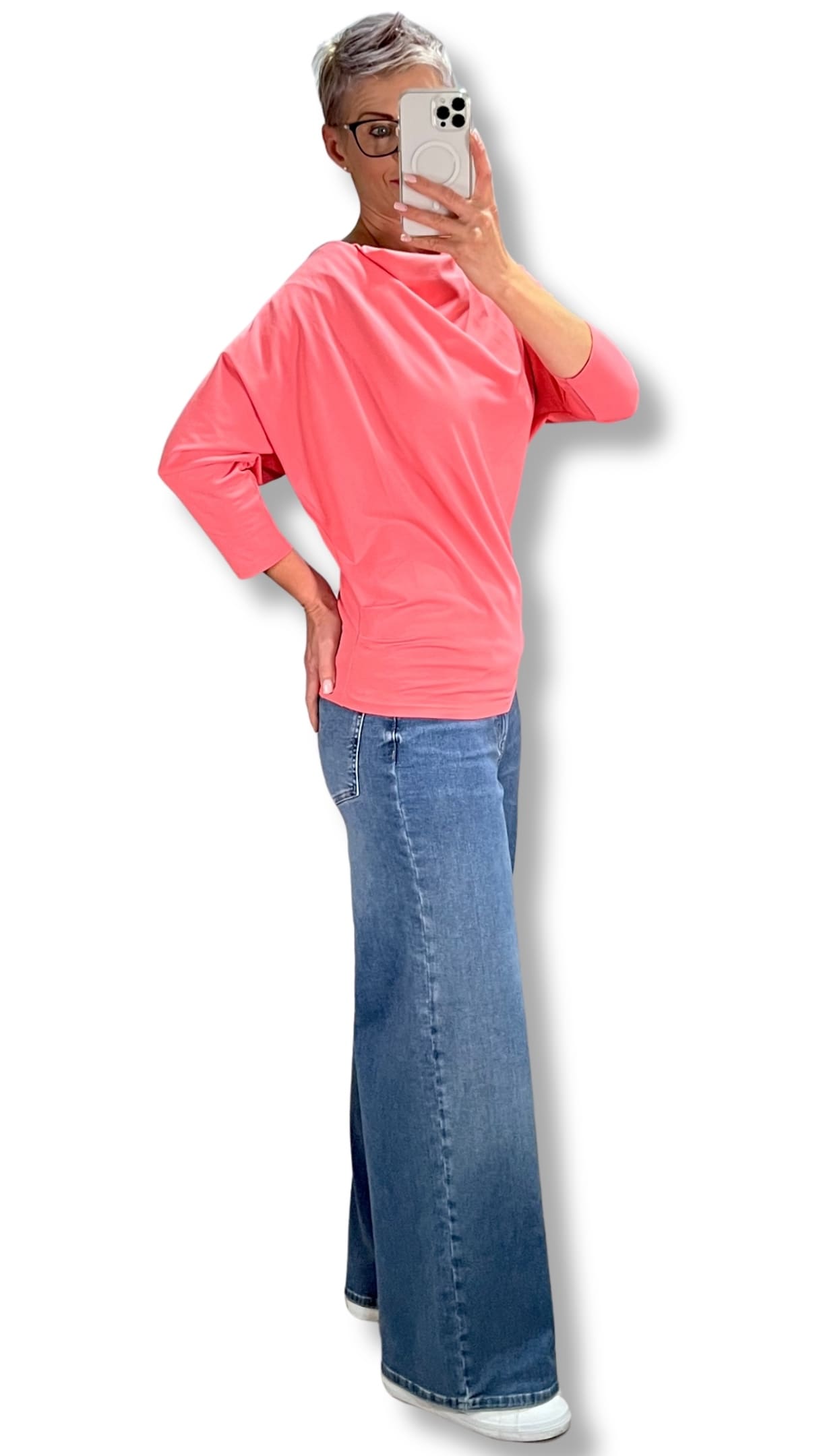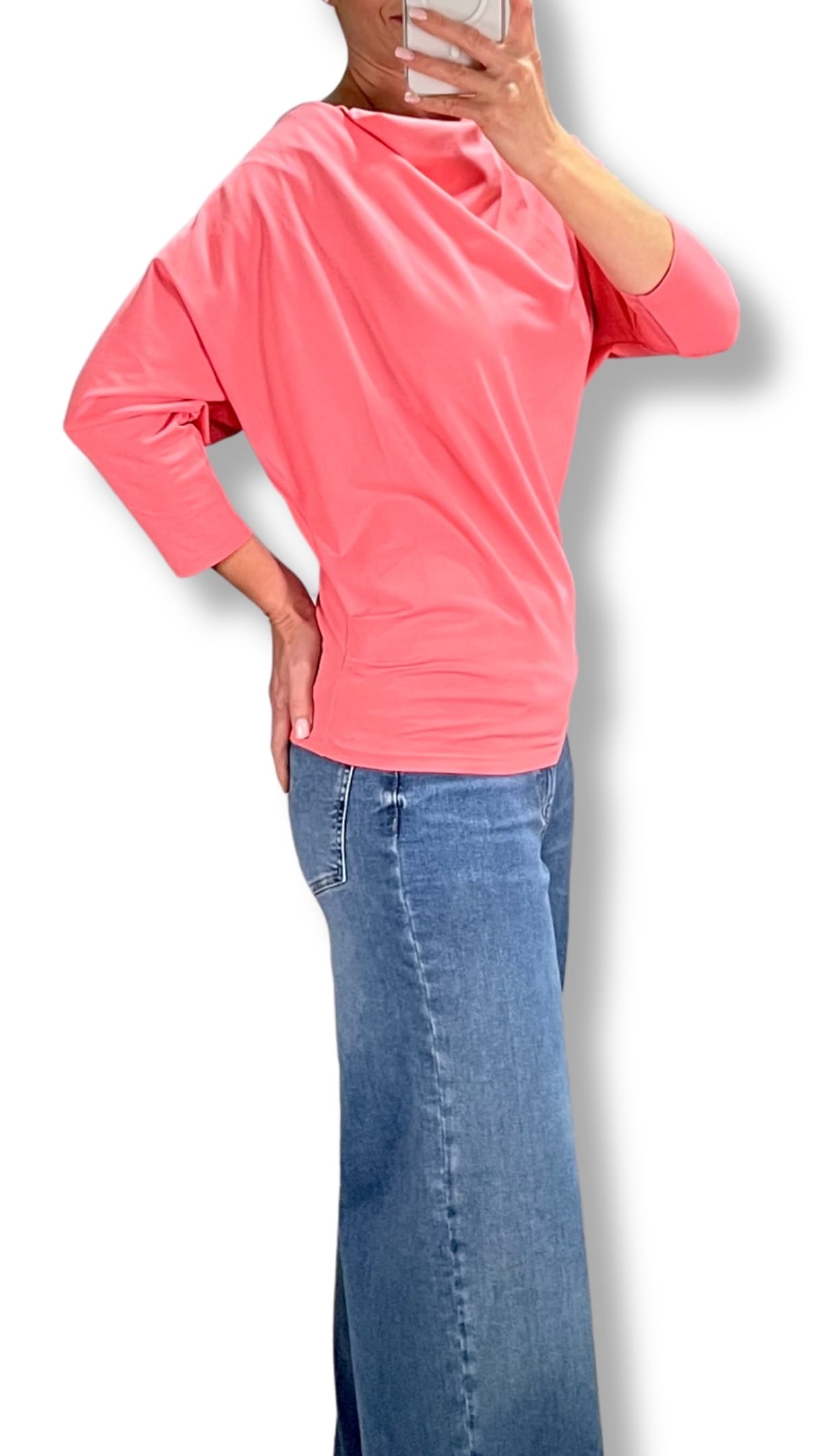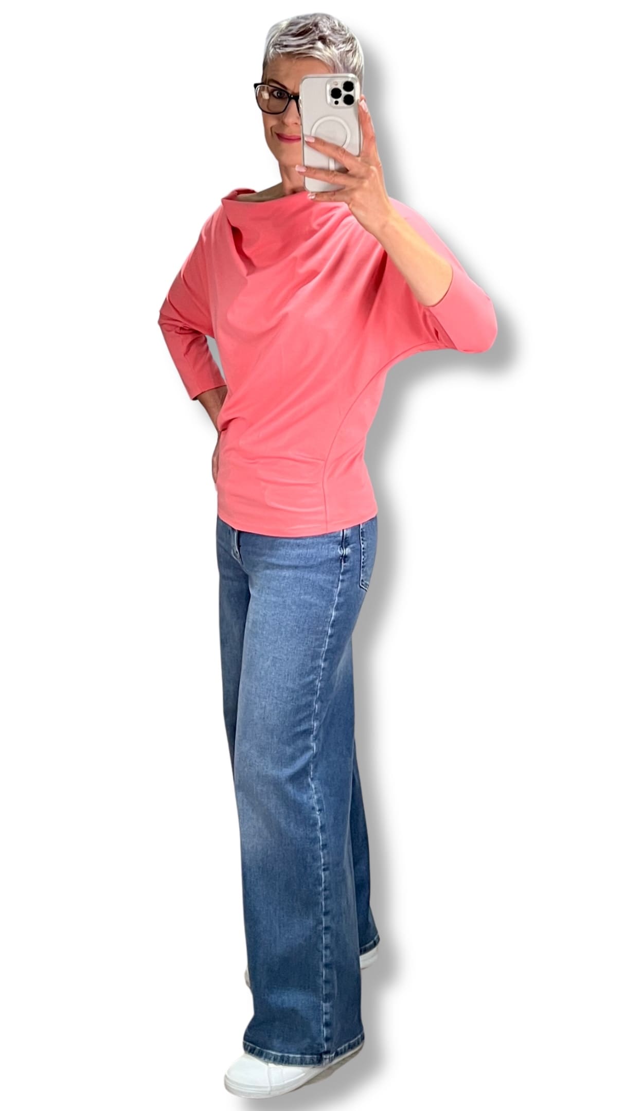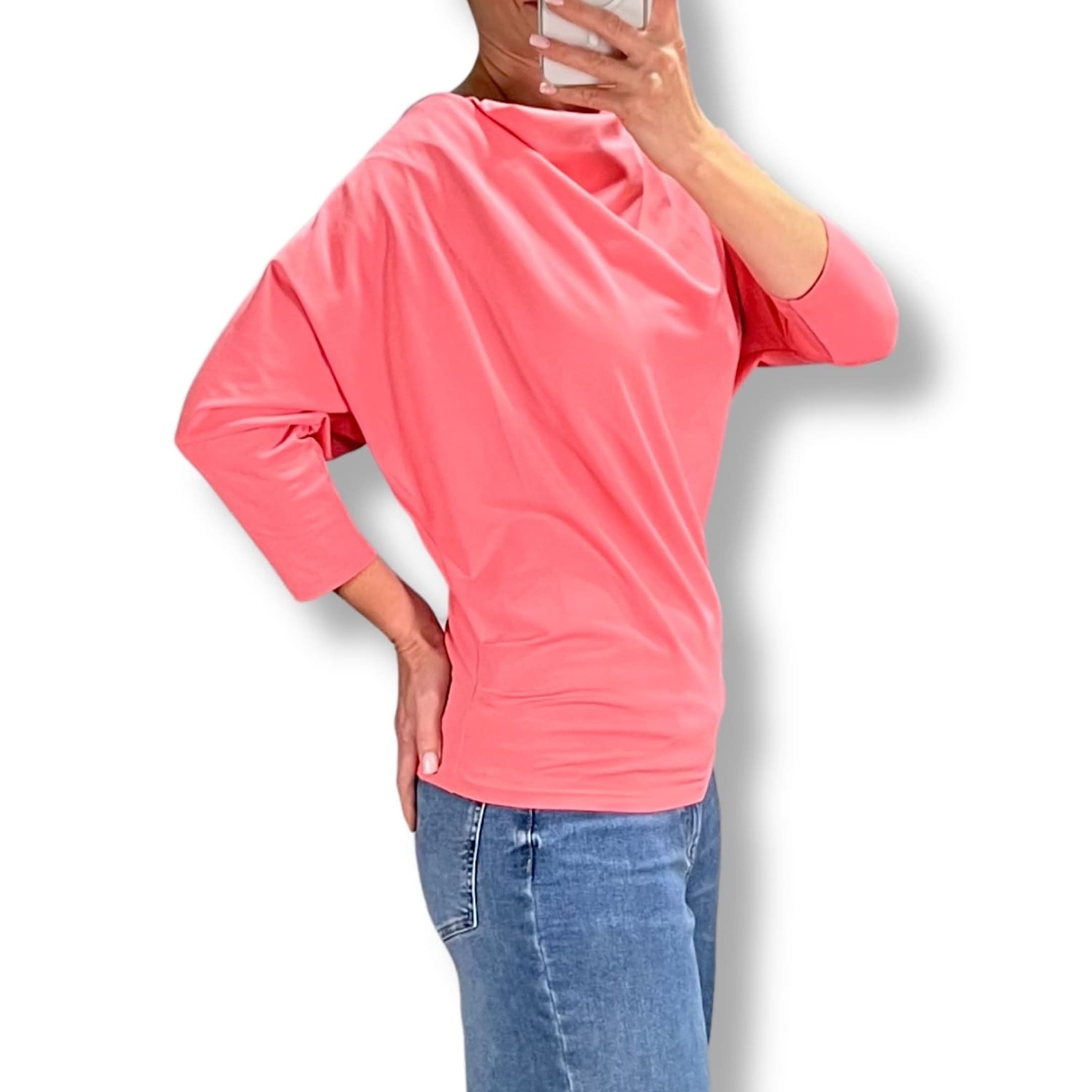 ➜ Prilagodljiv stil nošenja: široka, sproščena oblika v zgornjem delu omogoča, da majčko nosiš na več načinov – klasično, malce fensi spuščeno na eno ramo ali bolj asimetrično