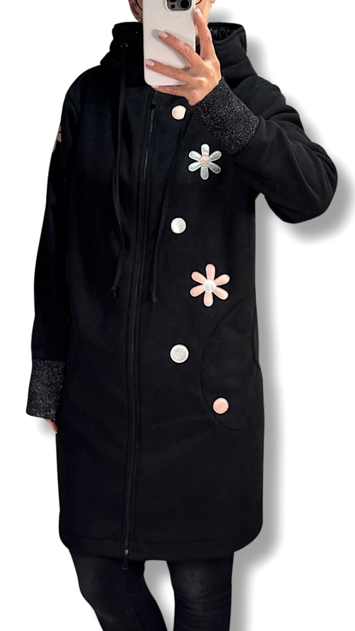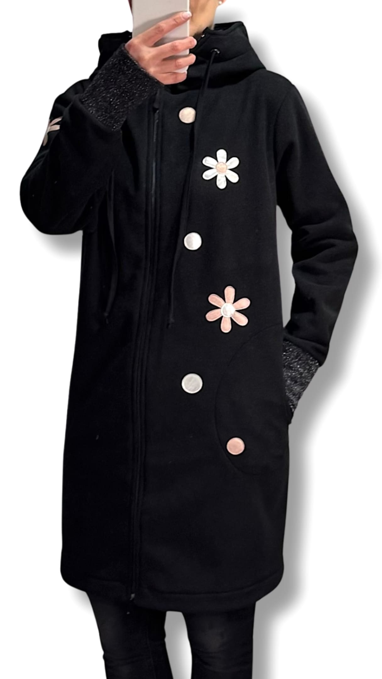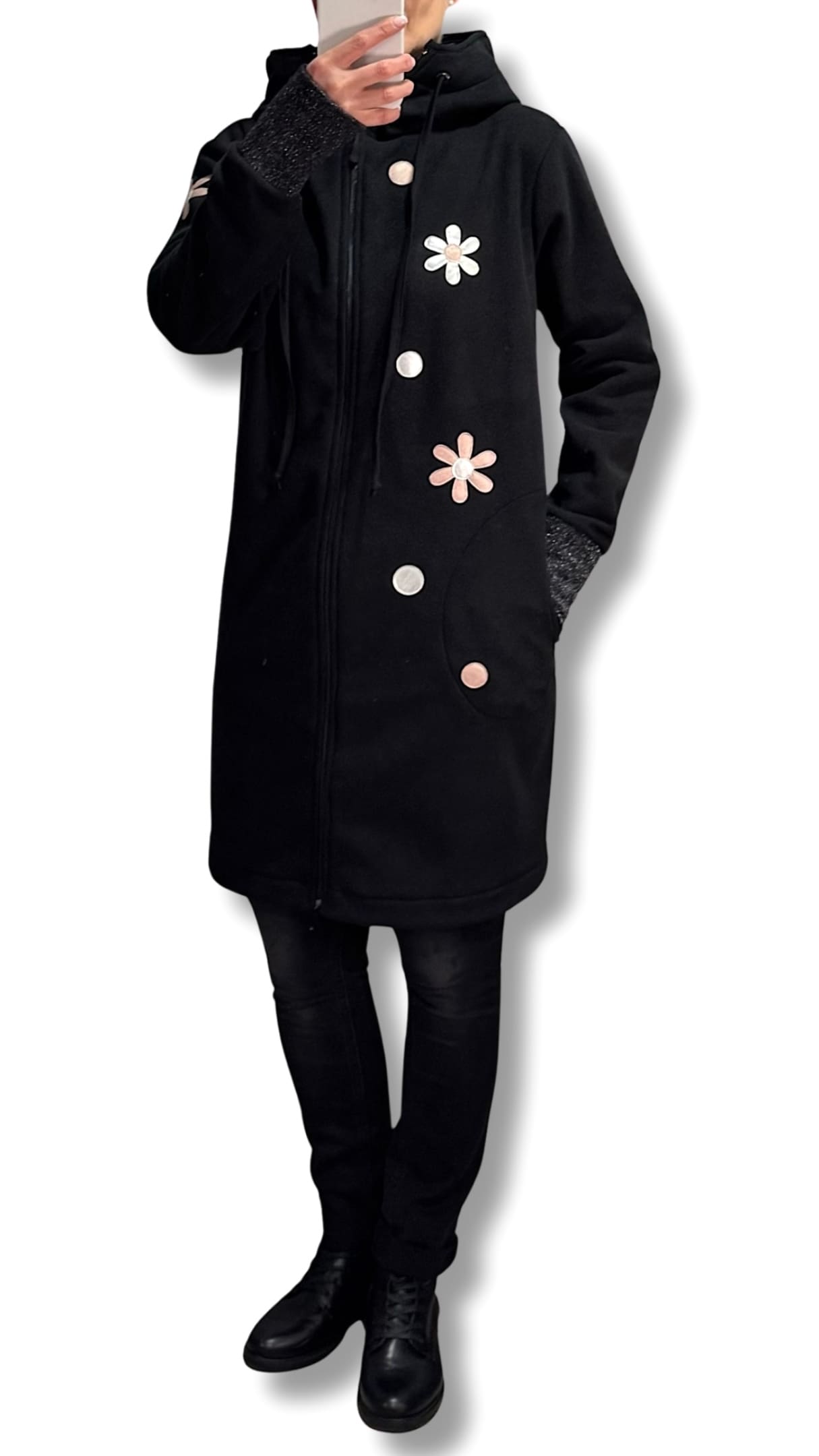 Možna je DOLŽINA po IZBIRI. Na sliki je predstavljena dolž. 90 cm, lahko je pa tudi 75 / 80 / 85 cm, ter kot krajša jakn’ca 65 ali 70 cm cm dolžine.