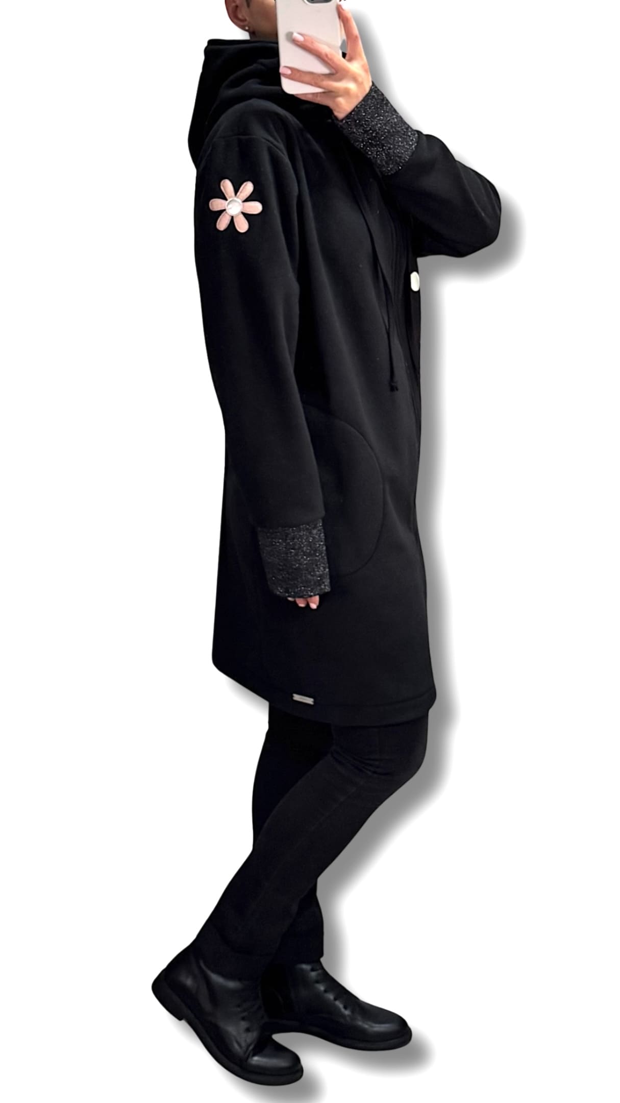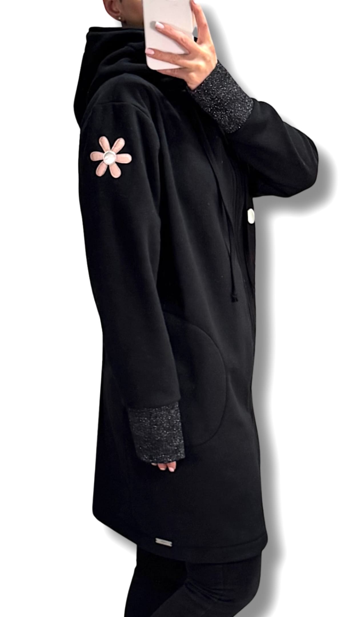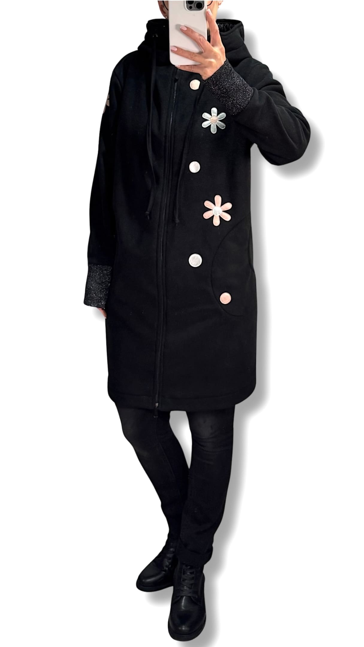 Možna je DOLŽINA po IZBIRI. Na sliki je predstavljena dolž. 90 cm, lahko je pa tudi 75 / 80 / 85 cm, ter kot krajša jakn’ca 65 ali 70 cm cm dolžine.